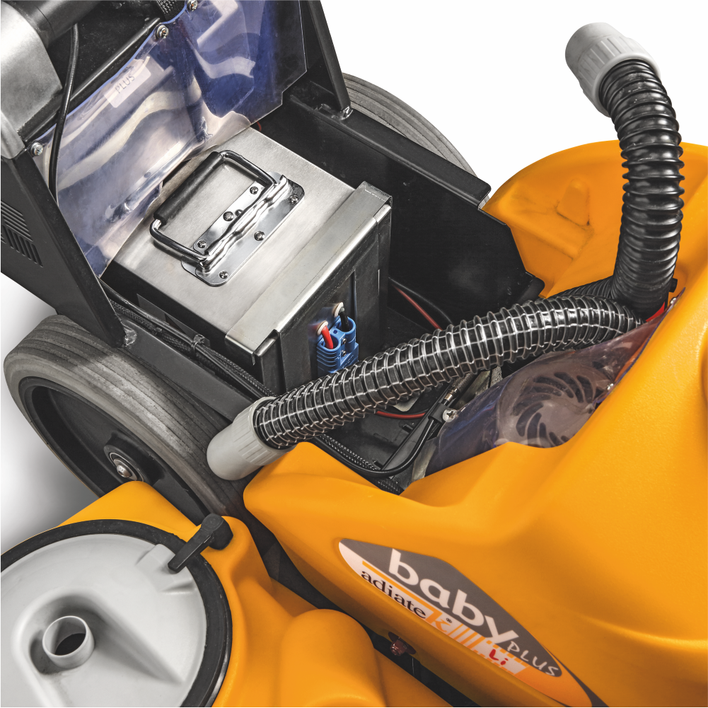 baby plus Li ist mit Lithium Batterien 24V 40 Ah5 und Ladegerät an Bord ausgestattet und kann bei Bedarf nach Entleerung der Batterien mit einem 20m langen Betriebs- und Ladekabel unbegrenzt weiter betrieben und gleichzeitig geladen werden.