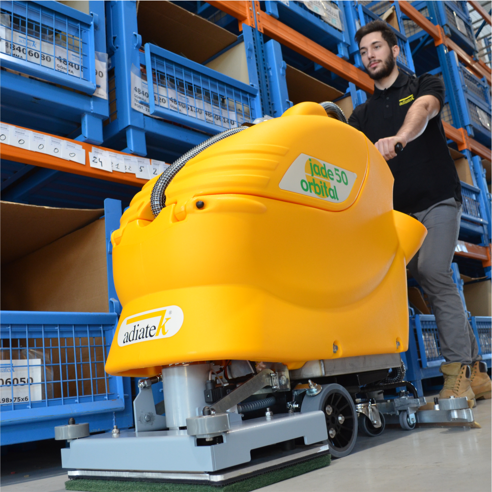 Die jade orbital wurde auf dem Maschinenkörper der jade aufgebaut, der seit vielen Jahren sehr ausgiebig getwurde. Sein hervorragendes Design und seine hohe Strapazierbarkeit bieten dem Anwender eine sehr hochweMaschinenbasis. Die jade orbital 50 verfügt über einen 400 Watt starken Antriebsmotor, somit überwindet sie Rampen ohne körperliche Belastung des Anwenders. Abgesehen von der besonderen Haltbarkeit der Adiatek Maschinen wird der Anwender die jade orbital als leicht zu bedienen und zu steuern erleben, selbst in engeren Bereichen. Darüber hinaus ist sie sehr pflegeleicht und ermöglicht auch hierdurch hohe Einsparungen. Das robuste Orbitaldeck wird durch belastbare Kunststoffrollen auf dem richtigen Wandabstand gehalten, woddas Kratzen an Wänden effizient unterbunden wird. jade orbital gewährleistet dank ihrem kraftvollen 750 Watt Motor höchste Reinigungsleistung auf allen Hartbodenarten. Diese Maschinenvariante ermöglicht die erhebliche Reduzierung von Rutsch- und Sturzgefahrsowie die Einsparung von Reinigungsmitteln und Wasser, dank ihrer erheblichen mechanischen Leistung.