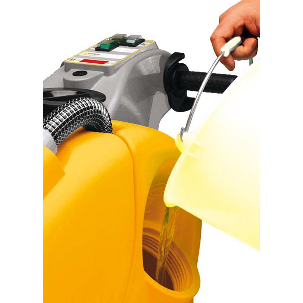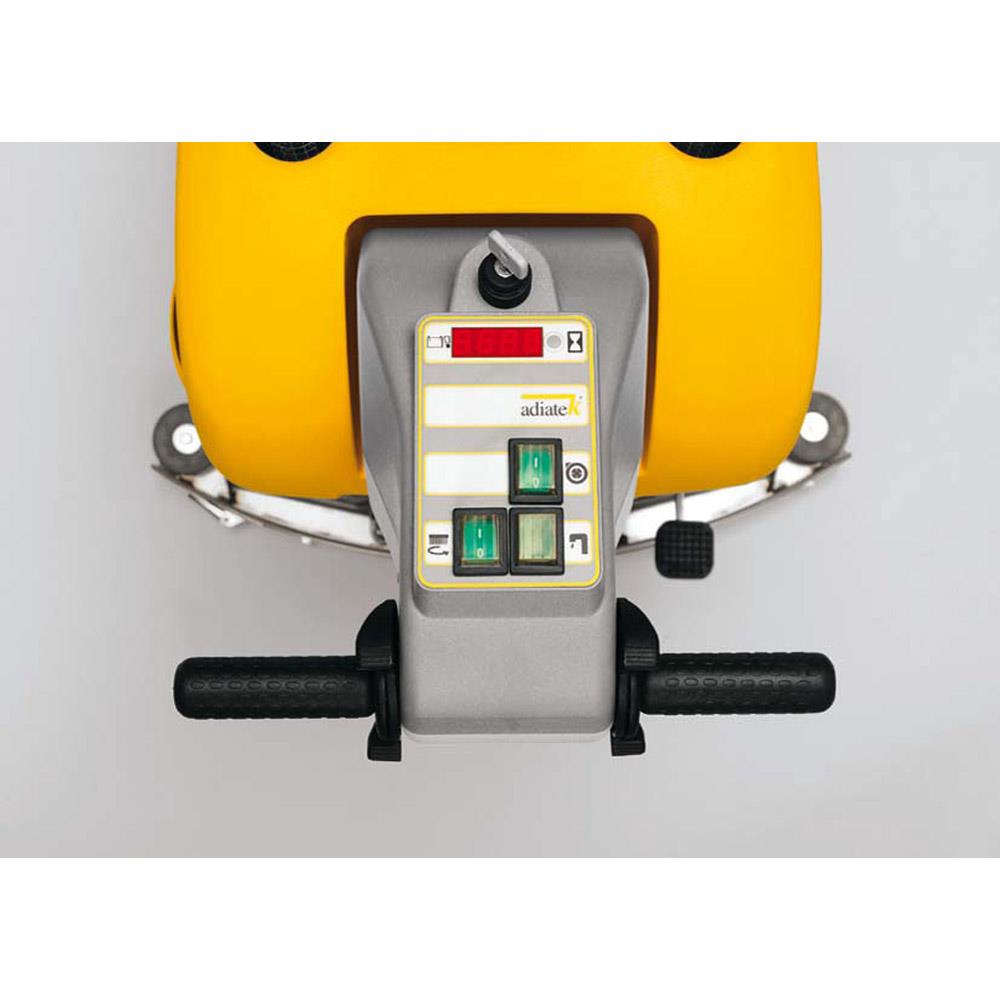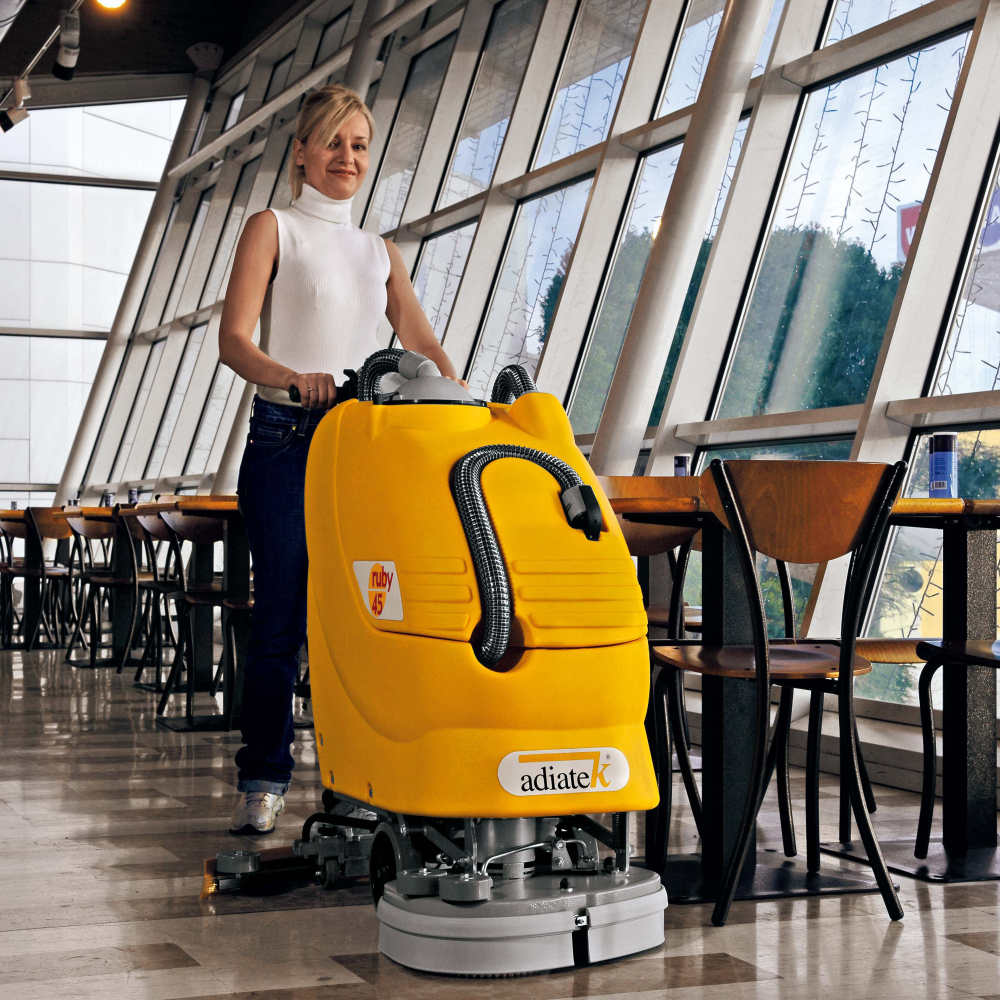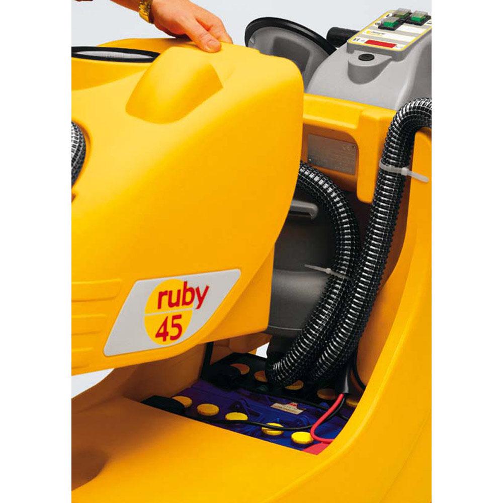 Batteriebetriebene Zweischeiben-Scheuersaugmaschine. Wahlweise mit oder ohne elektrischen Vorschub. Ihr großes Batteriedeck ist wie bei allen rubys in rostfreiem Edelstahl ausgeführt, sodass die ganze Maschine effizient vor Batteriesäure geschützt ist. Der Bürstendruck kann manuell an verschiedene Bodenstrukturen angepasst werden. Für die Version ohne Antriebsmotor besteht die Möglichkeit, durch Einstellung der Bürstenneigung die Vorschubgeschwindigkeit zu regeln.