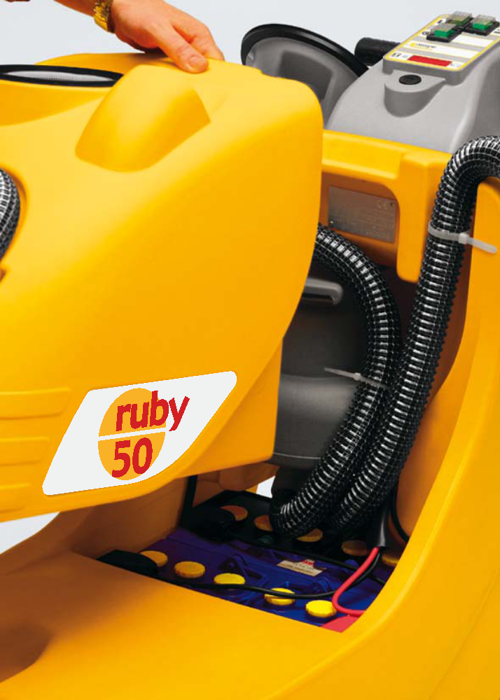 Wahlweise mit oder ohne elektrischen Vorschub. Dieser Maschinentyp arbeitet mit höherem Bürstendruck als die Zweischeibengeräte. Die Maschinen der Serie ruby sind durch die patentierte Saugmotorkapsel besonders Geräuscharm. Die Einscheibenversion ist durch das automatische Bürstenauswurf- und -aufnahmesystem besonders für den Einsatz in Schulen und Krankenhäusern geeignet, wo häufiger Bürstenwechsel erforderlich ist.