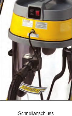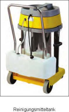 Sprühextraktions-Sauger auf Fahrgestell. Edelstahlbehälter. Die CEME Ausführung ist mit einer leistungsstarken 60 W Pumpe ausgestattet, Sprühleistung 4,25 l/min, Sprühdruck 6 bar. Die ULKA Ausführung ist mit einer leistungsstarken 28 W Pumpe ausgestattet, Sprühleistung 0,95 l/min, Sprühdruck 4 bar. Überlastschutz der Pumpe Separate Pumpensteuerung. Standard Flüssigkeitsablass. Kann mit speziellen Zubehör „auf Anfrage“ als Nass-Trocken-Sauger verwendet werden. AUTO Ausführung mit nur einer Handdüse und einem 6 m Sprühschlauch Ø 40.